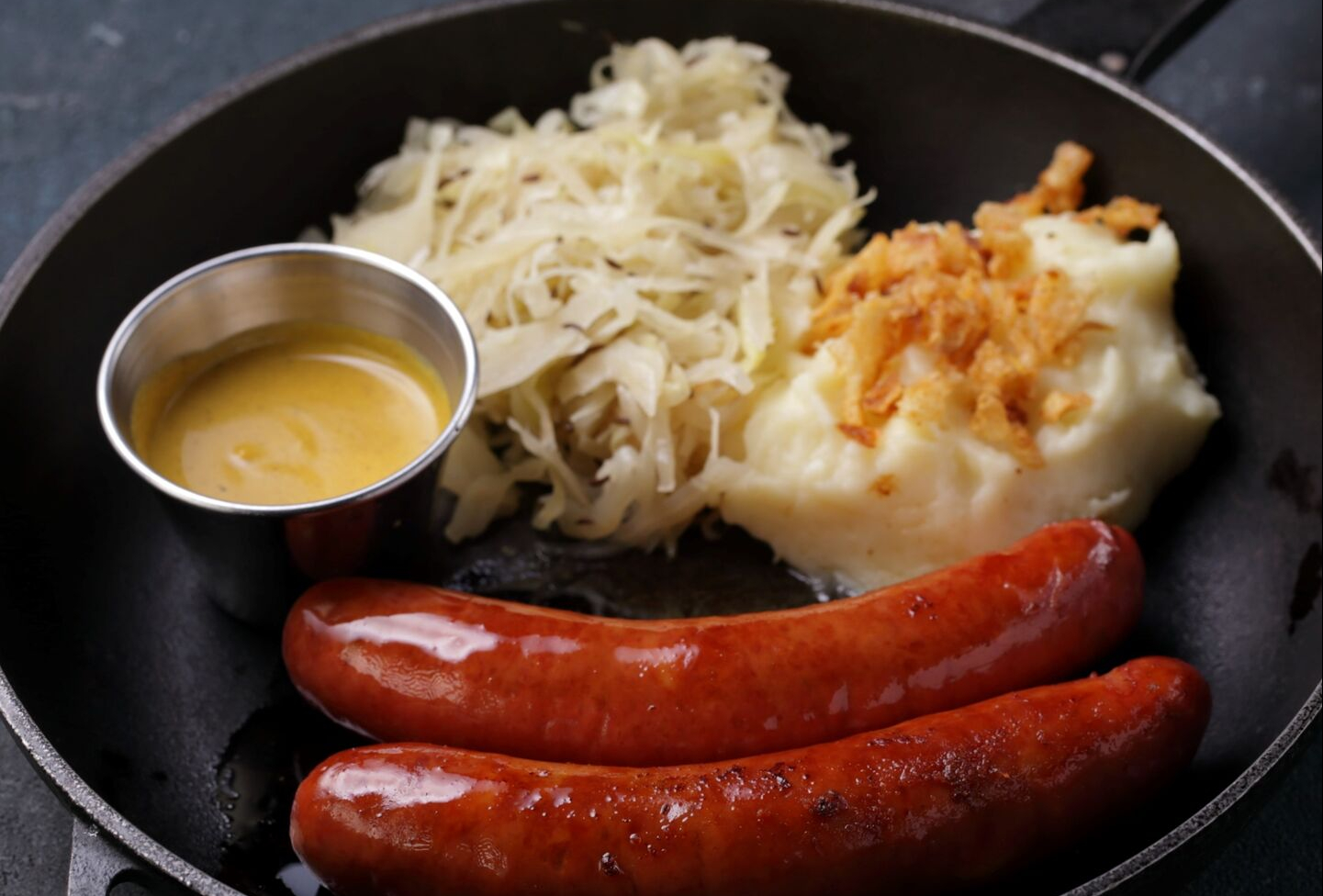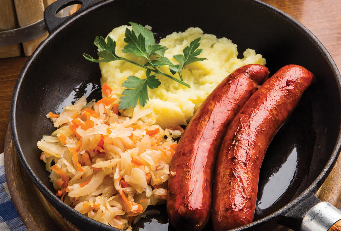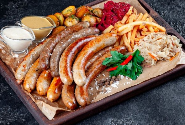 Баварские колбаски — истинное гастрономическое удовольствие! Сочные колбаски из свинины и говядины с добавлением шпика прекрасно дополняются гарниром из тушёной капусты и картофельного пюре. Попробуйте вкус настоящей баварской кухни!
