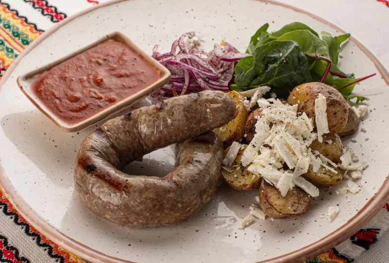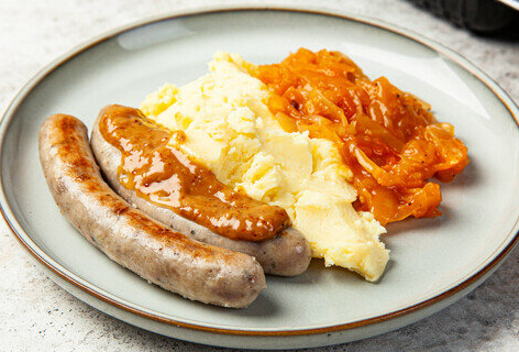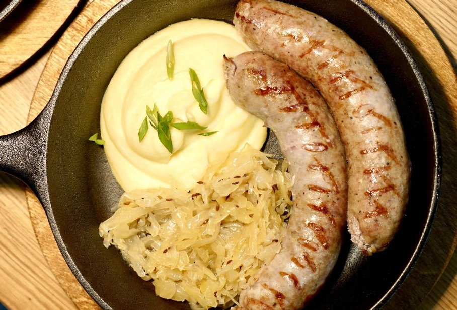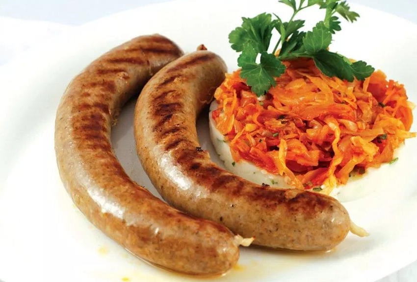 Сочные колбаски из говядины с пряными специями и нотками красного перца. Подаются с тушёной капустой и картофельным пюре. Вкус насыщенный, с умеренной остротой.